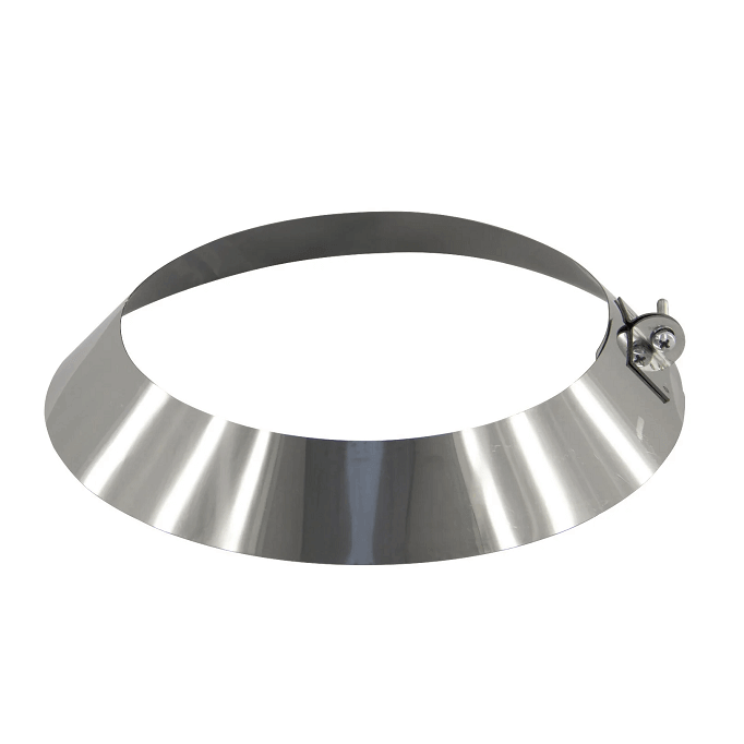 Обжимной хомут конусный (юбка) используется в качестве завершающего элемента для защиты от попадания осадков в зазор между трубой дымохода и конусом прохода кровли. Юбка может использоваться и в качестве декоративного элемента. Представляет собой усеченный конус из нержавеющей стали. Края стягиваются с помощью болта и гайки.