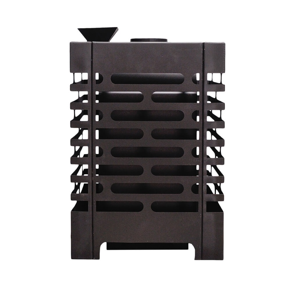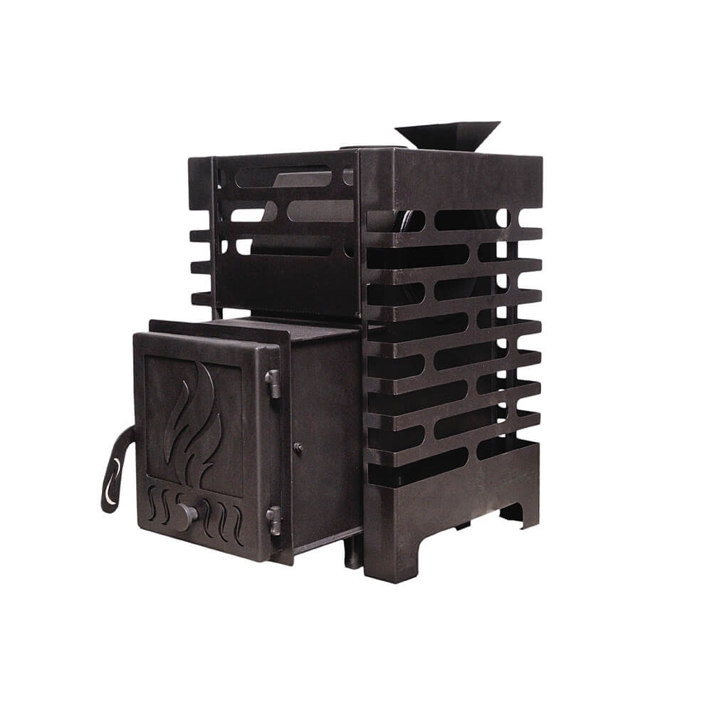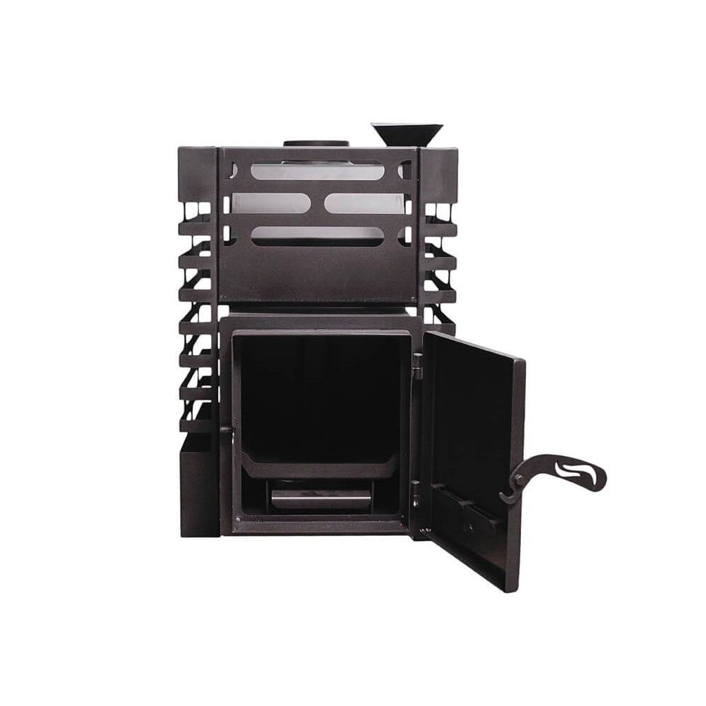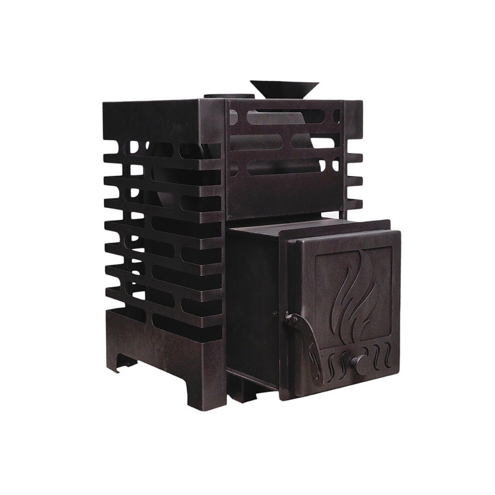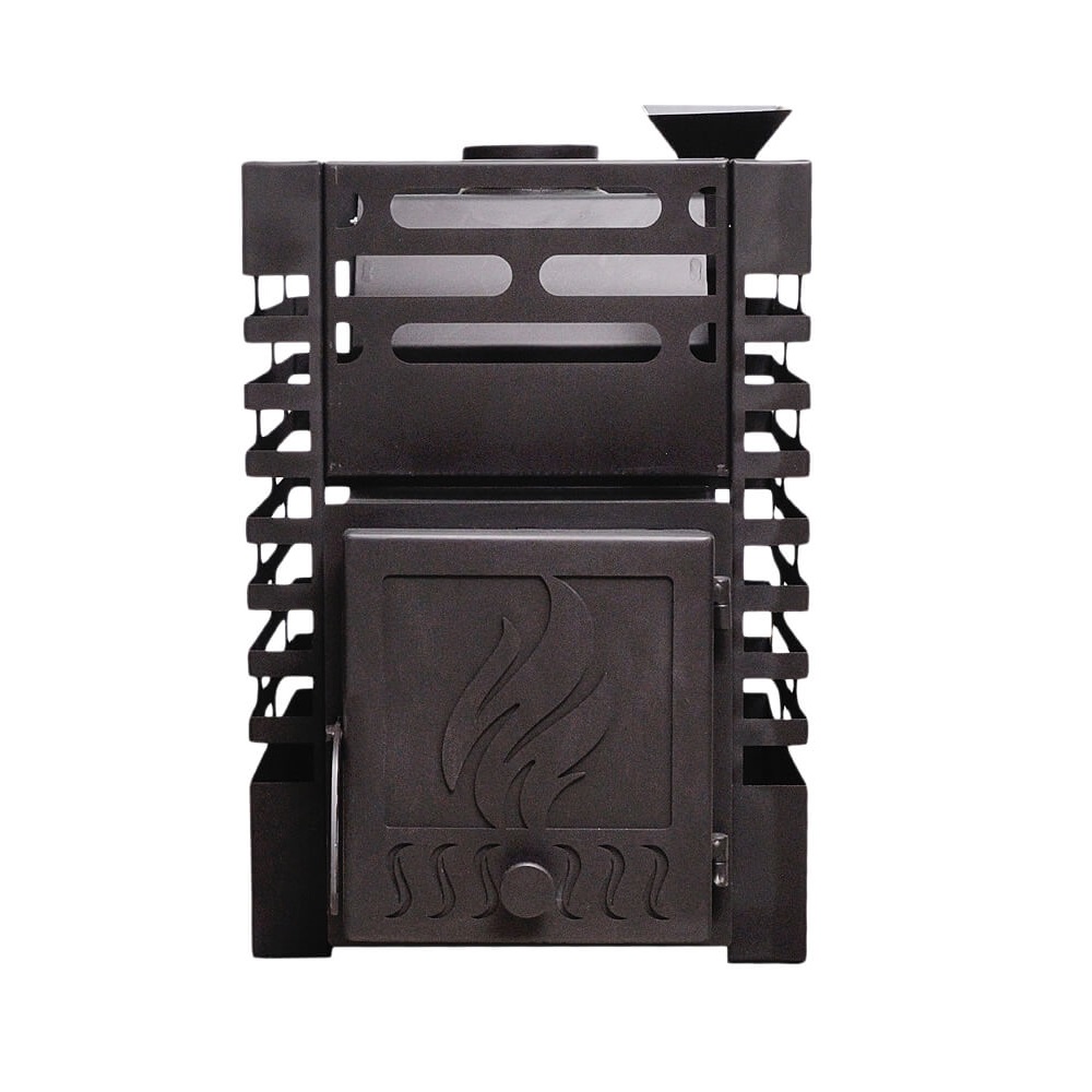 Сетка-каменка обрамляет топку и вмещает в себя 60-70 кг. камней. Также есть внутренняя закрытая каменка, подача воды в которую осуществляется через воронку, вынесенную наверх. Такая каменка позволяет получать легкий и мягкий пар.