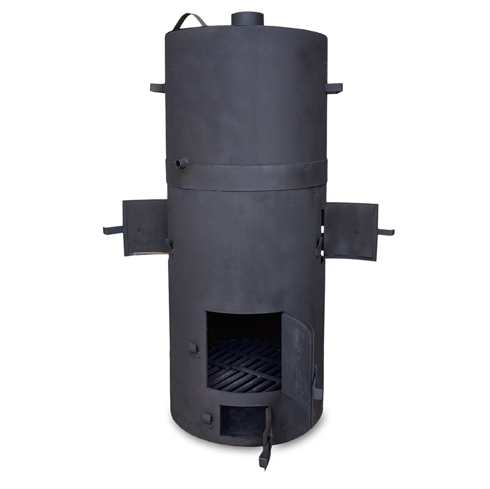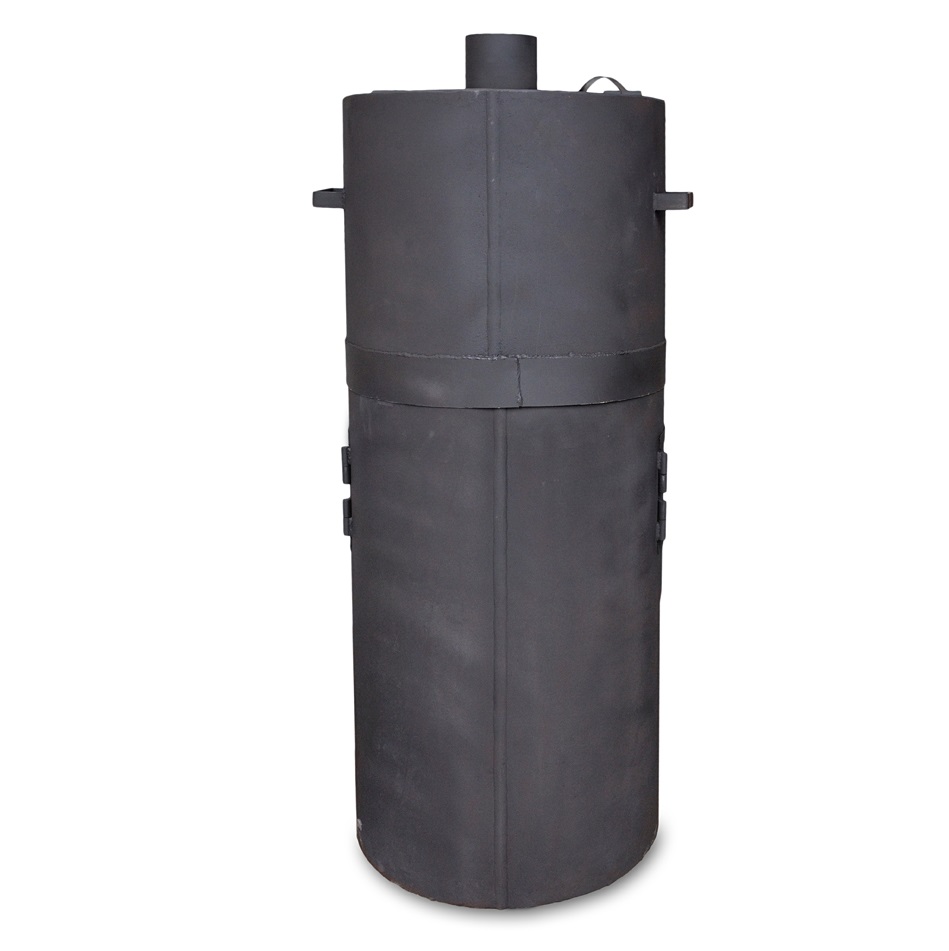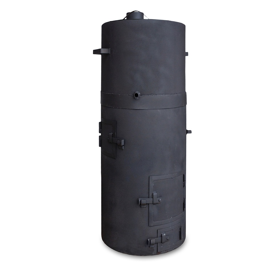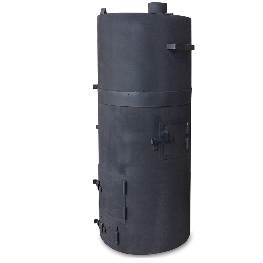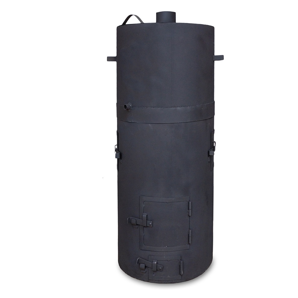 Банная печь с закрытой каменкой. Материал изготовления – сталь толщиной 8 мм. Вид топлива – дрова. Бак устанавливается сверху на основную часть, при необходимости – снимается. Печь имеет несколько модификаций в зависимости от расположения в бане: каменка слева, каменка справа, проходная (сквозная) каменка. Печь красится жаростойкой краской Certa.
