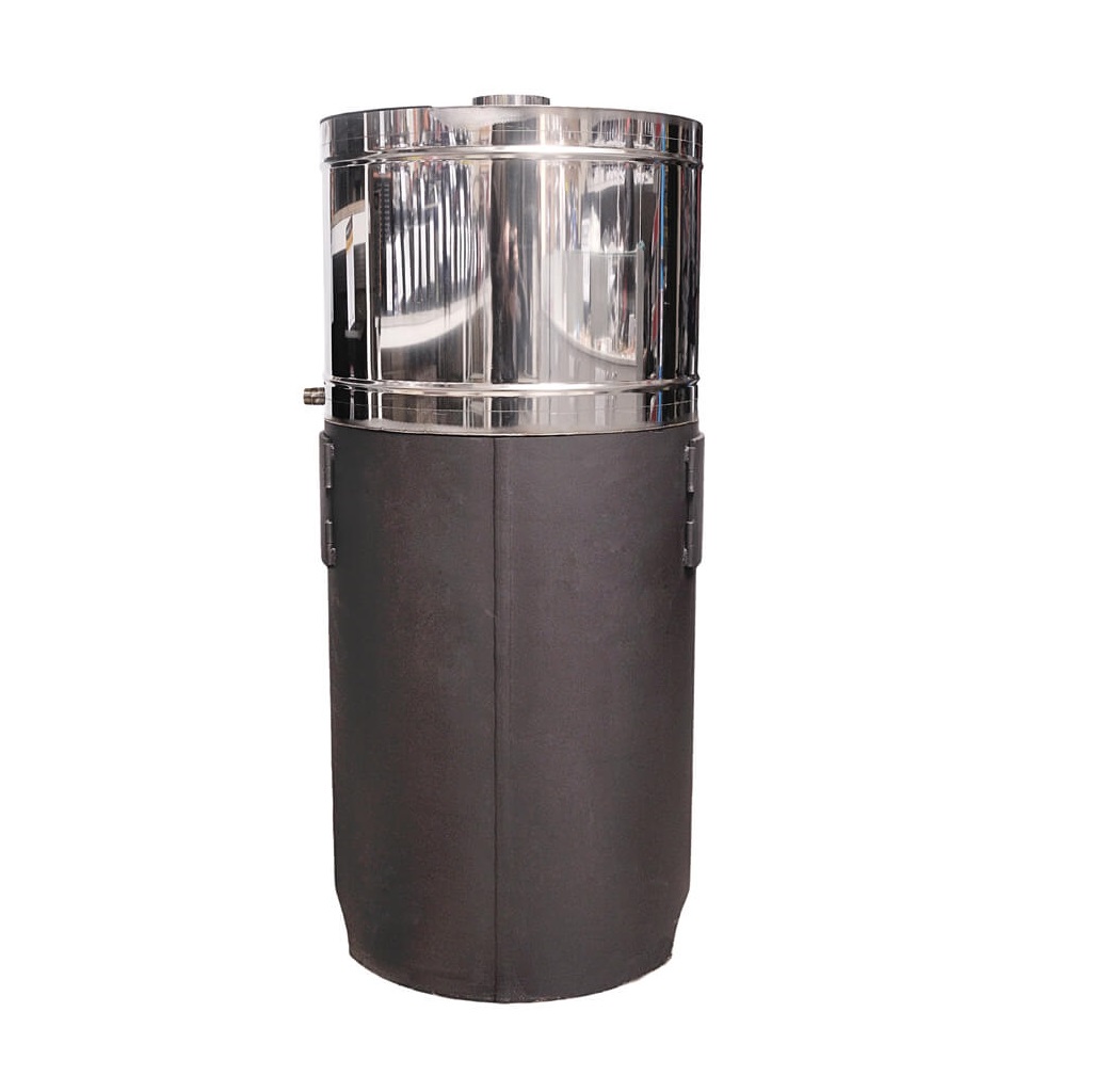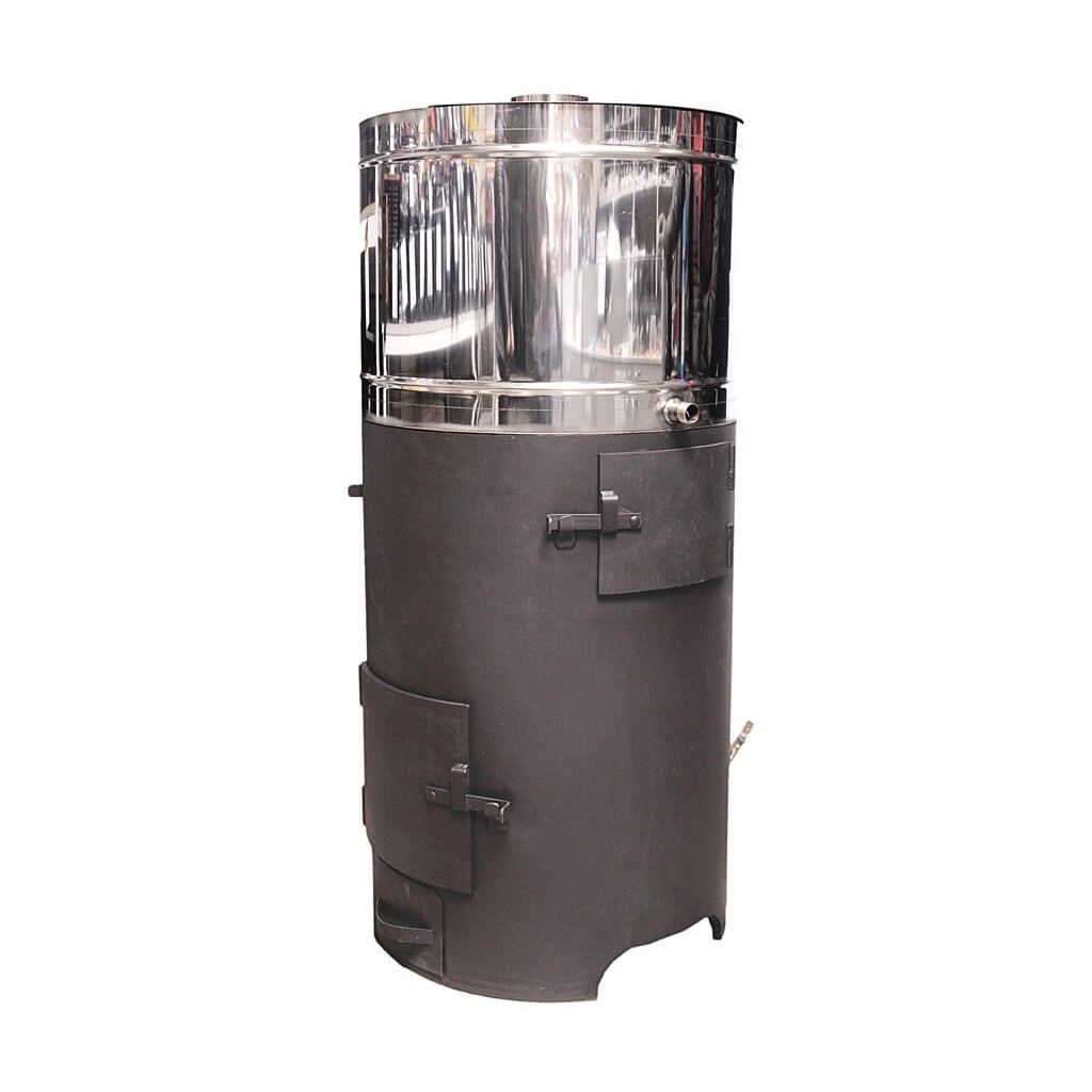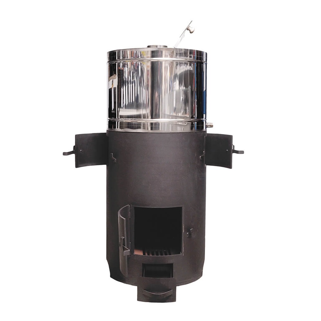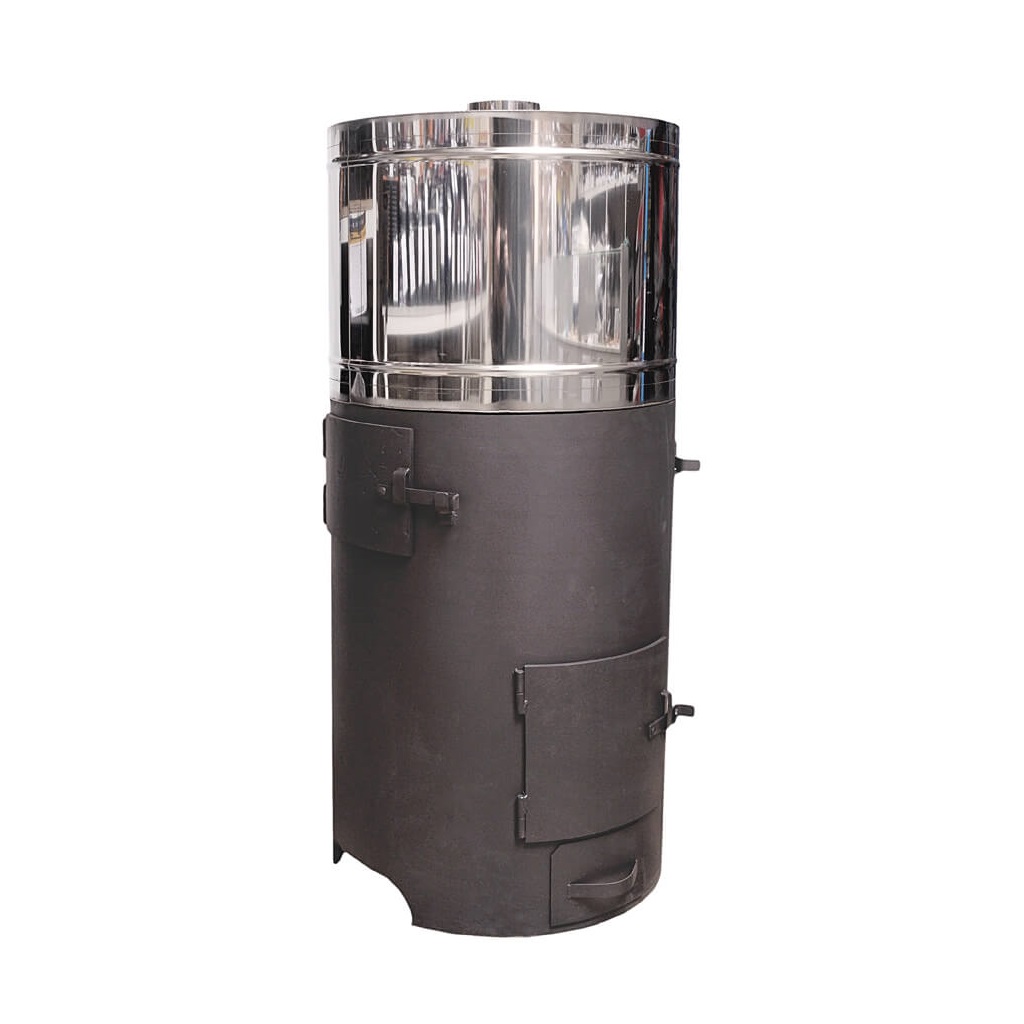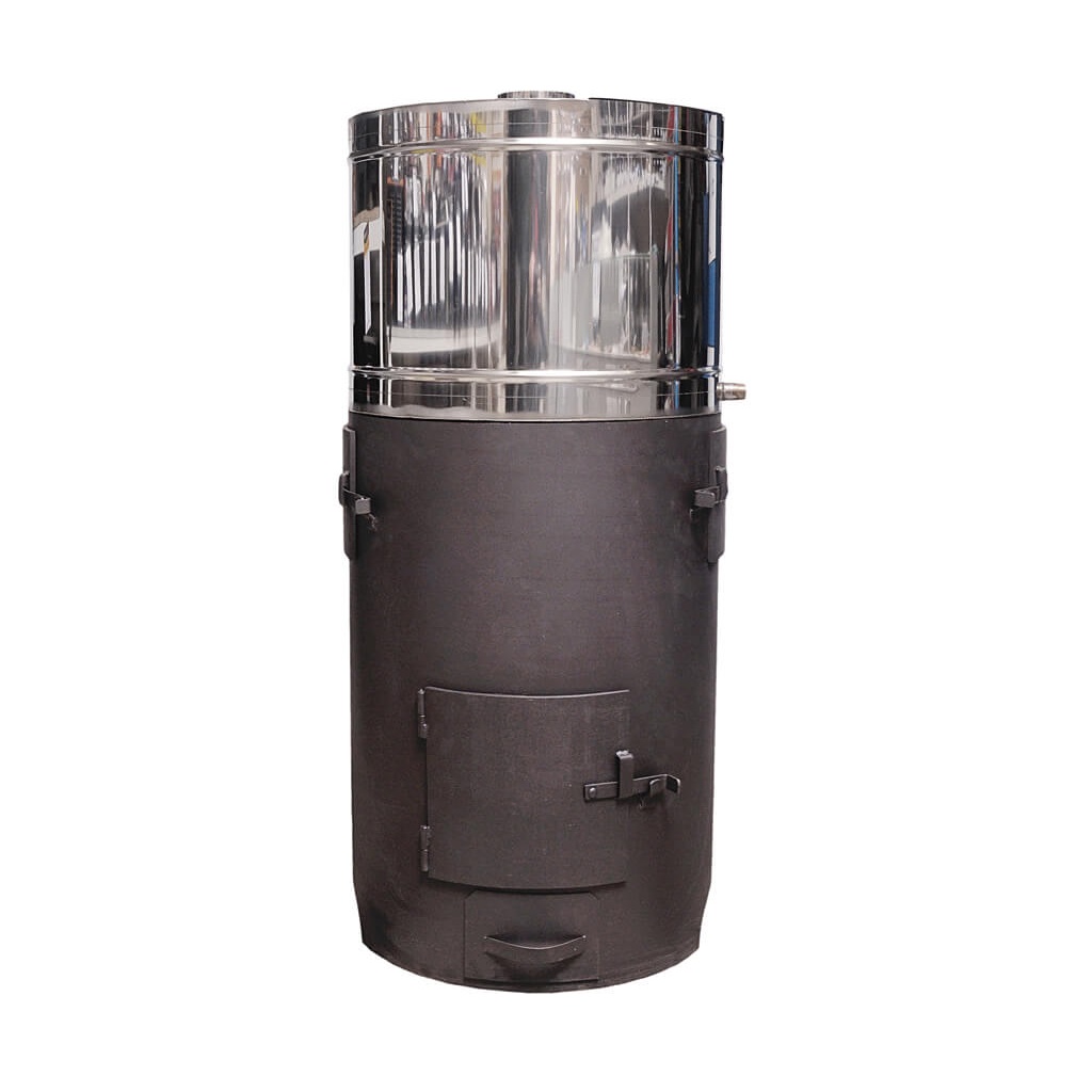 Банная печь с закрытой каменкой. Материал изготовления – сталь толщиной 8 мм. Вид топлива – дрова. Бак устанавливается сверху на основную часть, при необходимости – снимается. Печь имеет несколько модификаций в зависимости от расположения в бане: каменка слева, каменка справа, проходная (сквозная) каменка. Печь красится жаростойкой краской Certa.