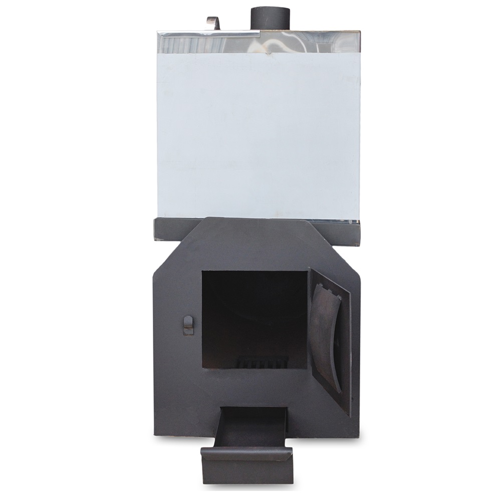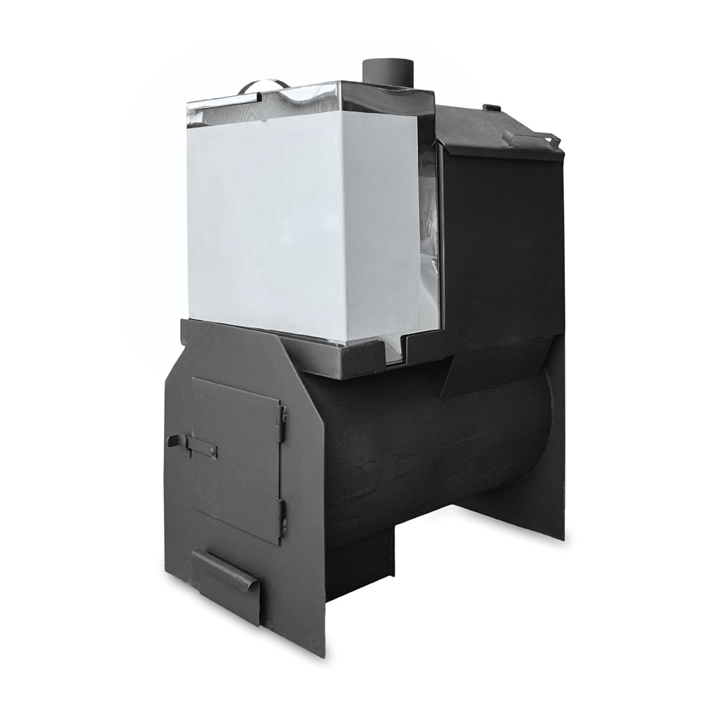 Печь банная Емеля с закрытой каменкой. Предназначена для эксплуатации в банных помещениях. Толщина металла в местах наибольшей термической нагрузки – 8 мм. Вид топлива – дрова. Конструкция предусматривает установку бака из нержавеющей или черной стали на площадку в передней части печи. С задней стороны имеется дверца для прочистки дымохода. Печь красится жаростойкой краской Certa.