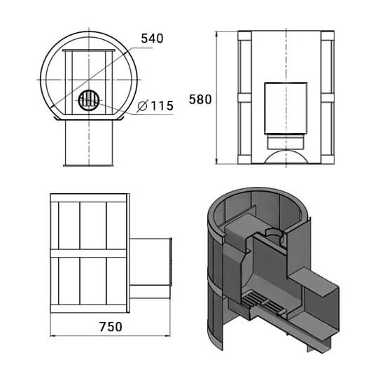 Печь изготовлена из конструкционной стали, имеет минимальное количество сварных швов, а в самых уязвимых местах, подверженных воздействию высоких температур, используются детали, отлитые из чугуна.