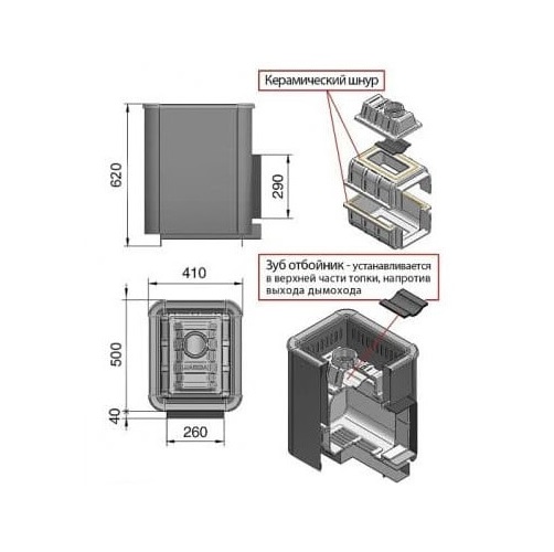 Топка печи состоит из 3-х элементов толщиной не менее 12 мм. На стыке между ними используется керамический шнур с рабочей температурой 1200 градусов, т.е. топка печи абсолютно герметична. Для фиксации деталей между собой применяется болтовое соединение, что даёт 100% гарантию безопасности при эксплуатации.