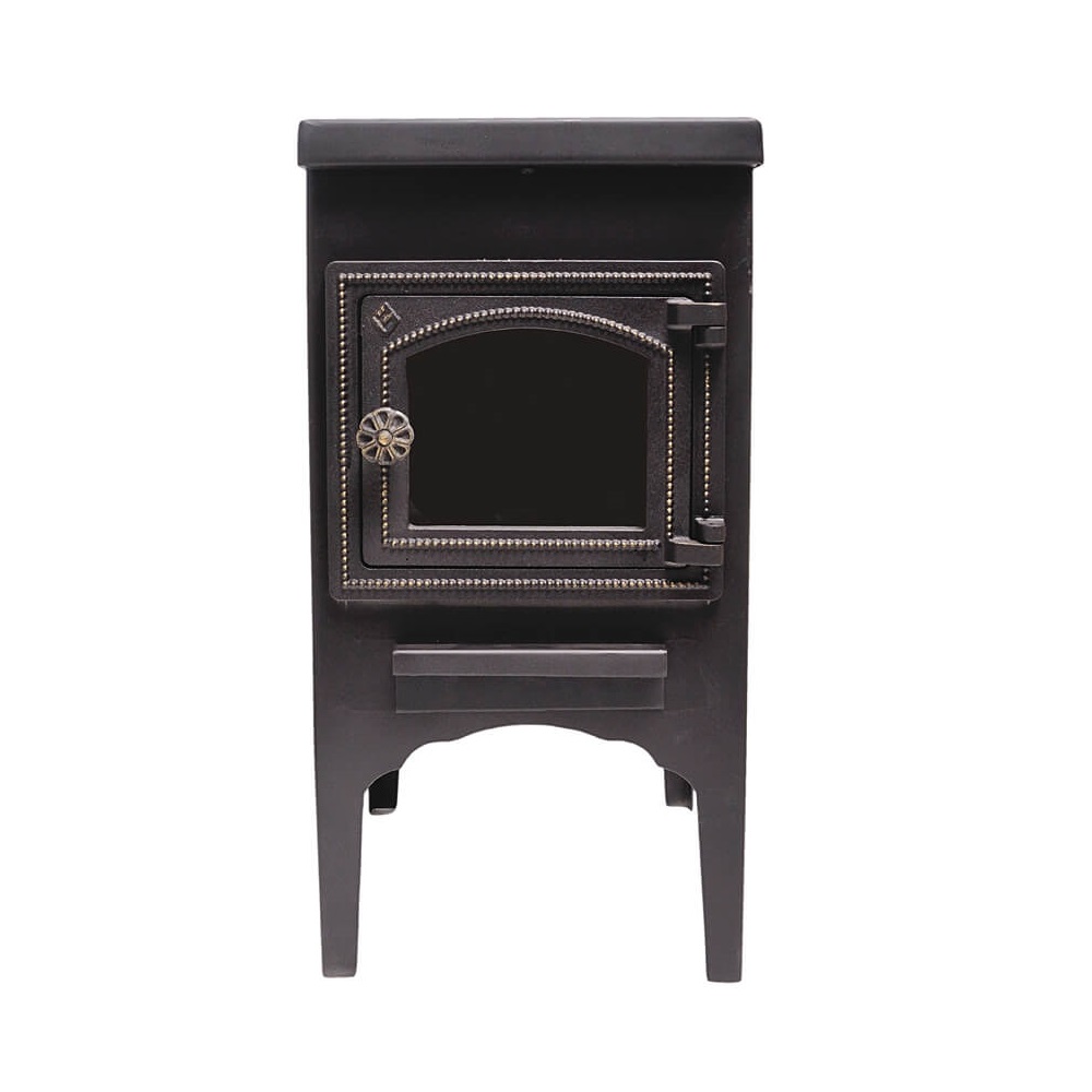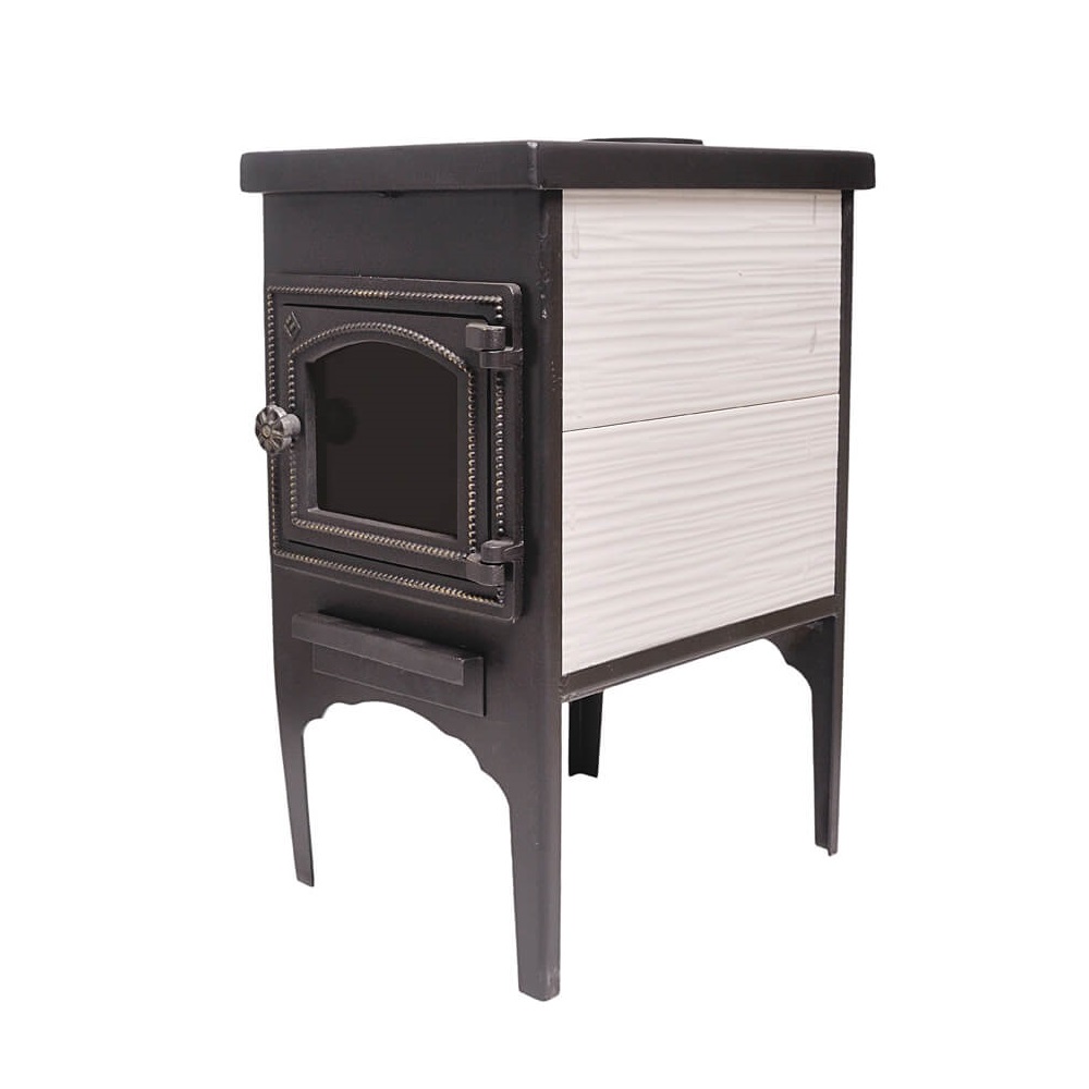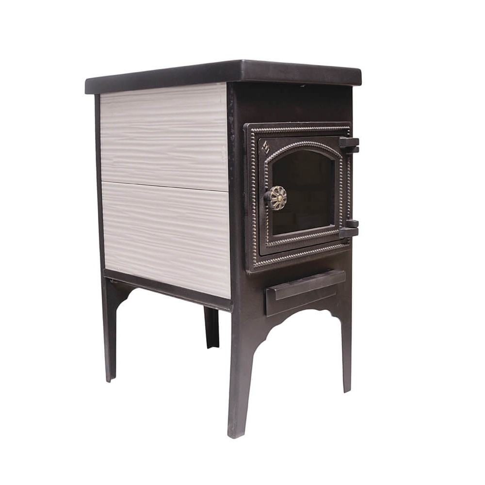 Верхнюю горизонтальную поверхность можно использовать для приготовления пищи. Печь укомплектована чугунным колосником и чугунной негерметичной дверцей ДТ-4. Печь облицована керамической плиткой для лучшего распределения тепла.