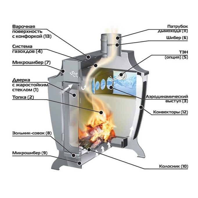 Топочная дверца печи дополнительно укомплектована стеклом через которое можно контролировать горение дров.